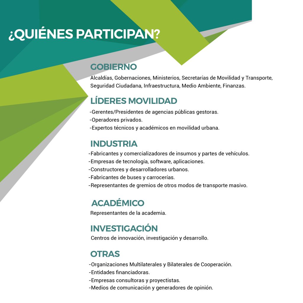 Nuestros eventos, se han constituido en un espacio para establecer diálogos constructivos que permiten conectar y relacionar a los actores decisores del sector político (alcaldes, gobernadores y prefectos); técnicos, expertos, operadores, industria y sociedad civil, para analizar y debatir en conjunto todos los aspectos que integran un modelo integral de movilidad urbana sustentable, que promueve como Derecho Social Fundamental a la Movilidad Urbana, con un claro liderazgo en el esfuerzo de revitalizar y transformar la movilidad en nuestras ciudades latinas, impulsando el desarrollo de Sistemas Integrados Multimodales que impacten en la calidad de vida de las personas, así como en el desarrollo y competitividad de las ciudades.